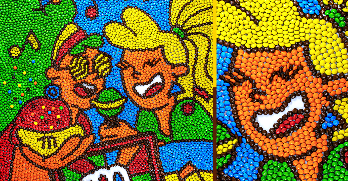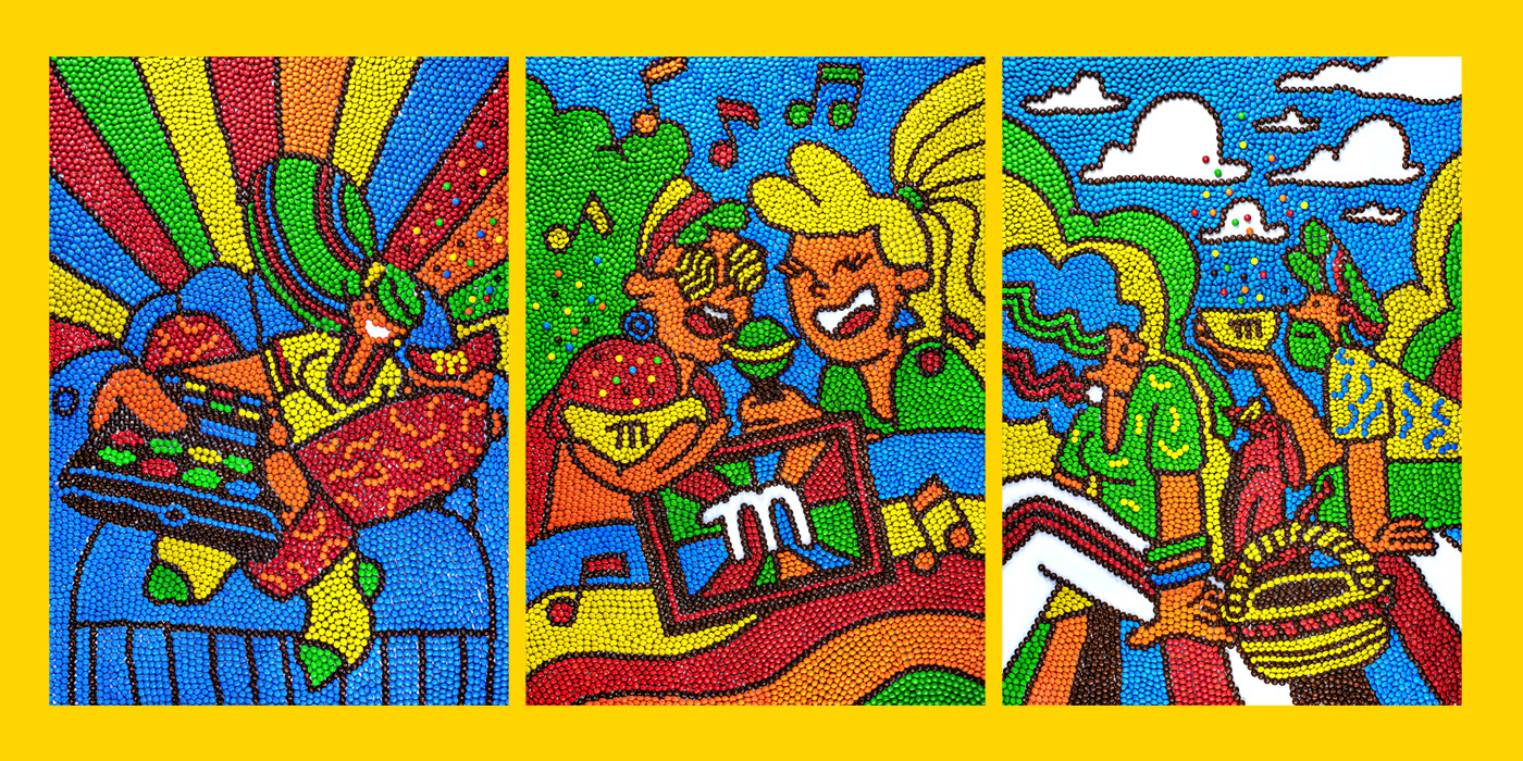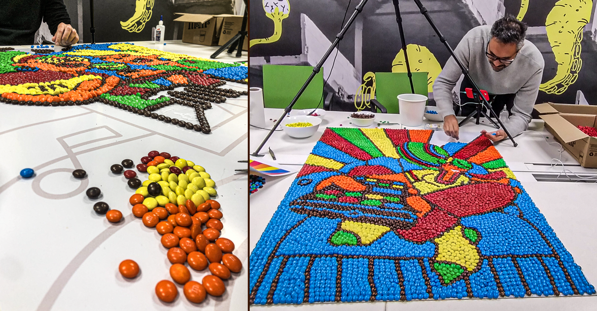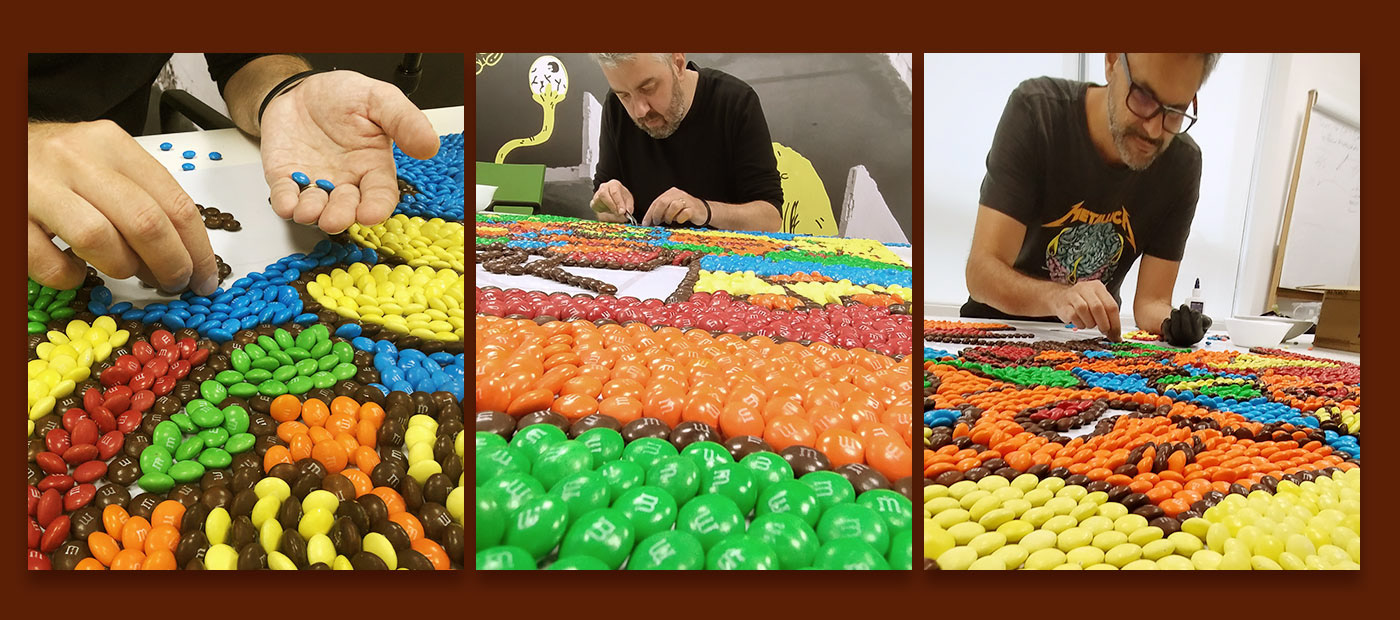 That's when we were invited to create three artworks made entirely of M&M'S®, showing that art can also be sweet. More than 37,000 lentils (as these beautiful mini chocolates are called) were used, and besides bravely resisting and not eating everything, we proved that they really don't melt in your hands.